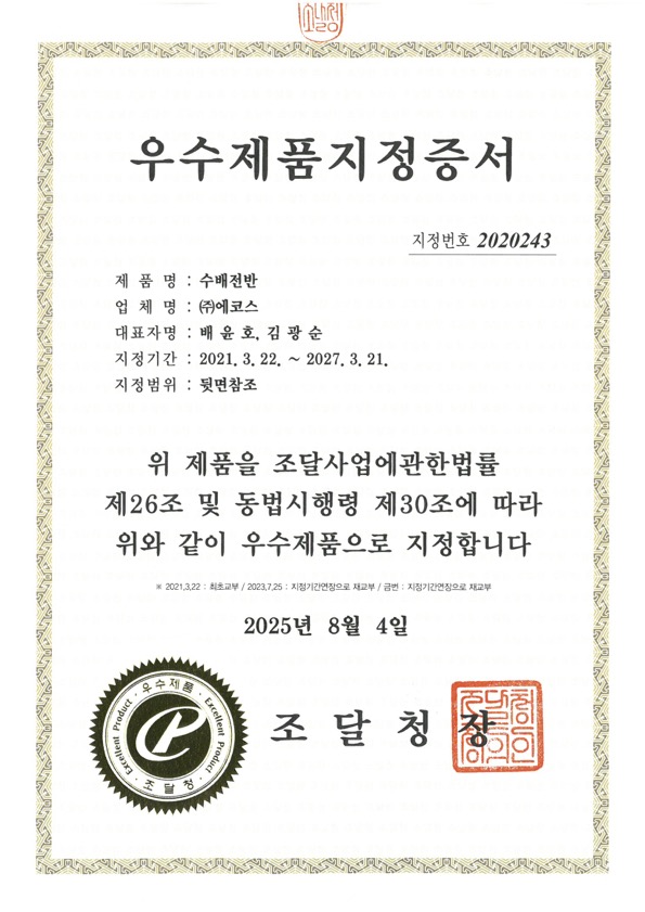 EKOS 배전반 조달 우수제품 인증서(기간연장)입니다. ~2027.3.21