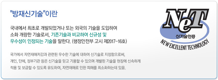 행정안전부에서는 "자연재해대책법" 제60조 및 제61조에 따라 방재기술의 보급 촉진과 실용화를 위해 방재신기술 지정제도를 운영하고 있습니다.